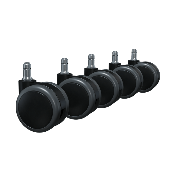 Standardrollen (hart) ermöglichen ein geschmeidiges Rollen auf Teppich, Filz oder PVC. Die spezielle Ummantelung verhindert dunkle Striche und reduziert den Abrieb auf weichen Untergründen. Insbesondere auf Teppichen sorgt ein hoher Rollwiderstand für sicheres und kontrolliertes Bewegen des Stuhls. Der integrierte Bremsmechanismus gibt das Rollen beim Sitzen frei und greift beim Aufstehen, um ein unbeabsichtigtes Wegrollen zu verhindern.