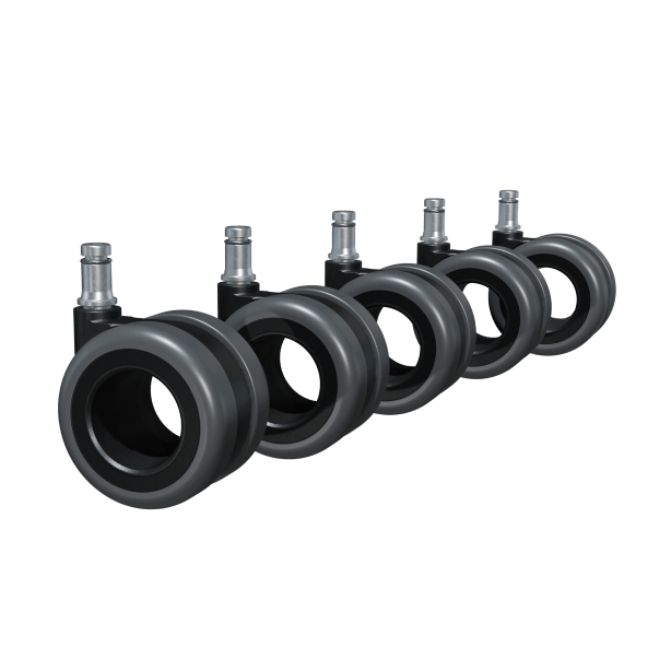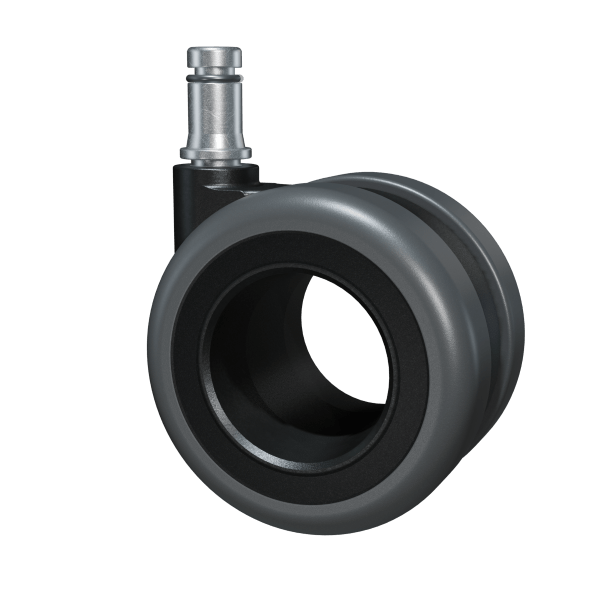 Designer-Doppelrollen (hart, achsenlos) sorgen für leichtes Design. Die harten Rollen ermöglichen ein geschmeidiges Rollen auf Teppich, Filz oder PVC. Die spezielle Ummantelung verhindert dunkle Striche und reduziert den Abrieb auf weichen Untergründen. Insbesondere auf Teppichen sorgt ein hoher Rollwiderstand für sicheres und kontrolliertes Bewegen des Stuhls. Der integrierte Bremsmechanismus gibt das Rollen beim Sitzen frei und greift beim Aufstehen, um ein unbeabsichtigtes Wegrollen zu verhindern.