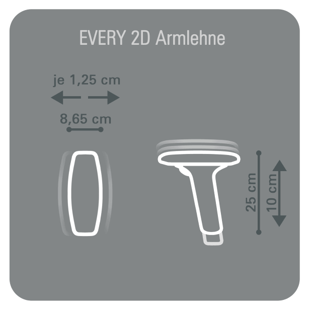 Die EVERY 2D Armlehnen sind in Höhe und Breite verstellbar. Das Armlehnenpad ist mit einer weichen Auflage ausgestattet. Die Armlehnen werden als Paar geliefert und können mithilfe einer Anleitung selbst getauscht werden.
