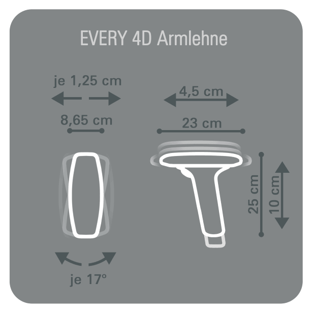 Die EVERY 4D Armlehnen sind in Höhe, Breite und Tiefe verstellbar. Das Armlehnenpad ist schwenkbar und mit einer weichen Auflage ausgestattet. Die Armlehnen werden als Paar geliefert und können mithilfe einer Anleitung selbst getauscht werden.