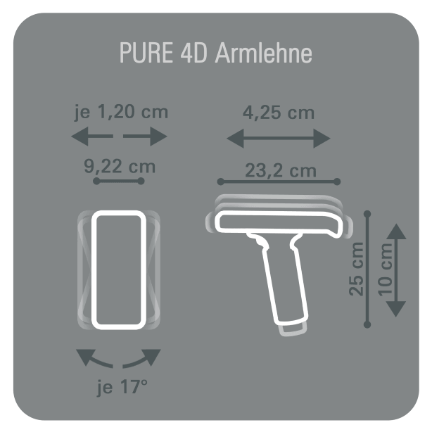 Die PURE 4D Armlehnen sind in Höhe, Breite und Tiefe verstellbar. Das Armlehnenpad ist schwenkbar und mit einer weichen Auflage ausgestattet. Die Armlehnen werden als Paar geliefert und können mithilfe einer Anleitung selbst getauscht werden.