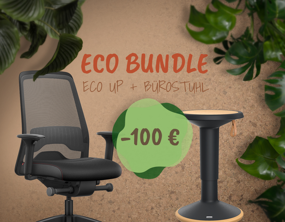 Der intuitiv höhenverstellbare Hocker ist nicht nur eine praktische Alternative für eine veränderte Sitzposition im Home Office sondern lässt sich auch flexibel in vielen weiteren Lebensbereichen einsetzen. Durch die Verwendung von biobasierten Kunststoffen und recycelten Materialien ist der ECO UP besonders nachhaltig produziert. Wähle jetzt deine Kombination aus nachhaltigem Sitzhocker und ergonomischem Bürostuhl und sichere dir deine 100 € Bundle-Rabatt.